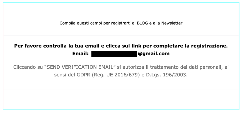 Cliccando su “SEND VERIFICATION EMAIL” si autorizza il trattamento dei dati personali, ai sensi del GDPR (Reg. UE 2016/679) e D.Lgs. 196/2003. |